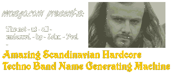 Version 2.0! New and improved! No more annoying reloading! And some of the words have changed!... slightly! Err.. Obviously this page was originally put together long before the lovely Mr Peel left us to go and get teenage kicks in whatever passes for an afterlife. Wherever he is, I hope he's having a fantastic time. Cheers John, we miss you. You know how it is, You've spent ages putting together your hardcore techno classic, comprising nothing but a drum machine going "thud thud thud thud" for exactly 23 minutes. You know full well that you don't really have a chart hit on your hands, but maybe... just maybe you'll get played by John Peel. But, and it's a big but... You're going to need a good name for your "Bass Collective" That's
